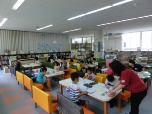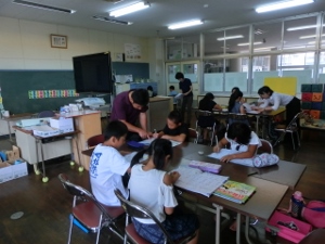 7/26(火) 学習教室一日目。主に夏休みの宿題に取り組んでいます。教室は暑いですが、分からないところを先生に聞いてがんばっていました。学習教室のあとは水泳教室がありました。