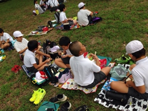 今日は暑いですが、青空タイムで体力づくりにがんばりました。一年生は手押し車をしました。真ん中まで行ったら交代します。