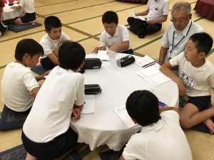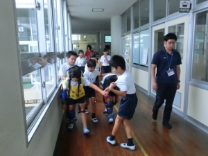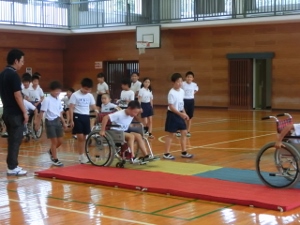 7/13(金) 4年生が玉名学の学習で、福祉体験をしました。玉名市社会福祉協議会の方に来ていただき、車椅子体験と高齢者疑似体験をしました。車椅子は意外と腕が疲れることや、高齢者の方は腰が曲がっていると歩くのがとてもきついことなど、体験を通して学ぶことができました。