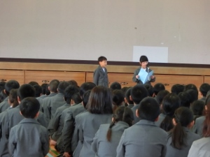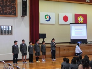 12/7(水) 児童集会で生活委員会が発表しました。ろうかを歩くこと、正しい服装などの呼びかけがありました。また、運営委員会から、赤い羽根共同募金と書き損じはがきについてのお知らせがありました。