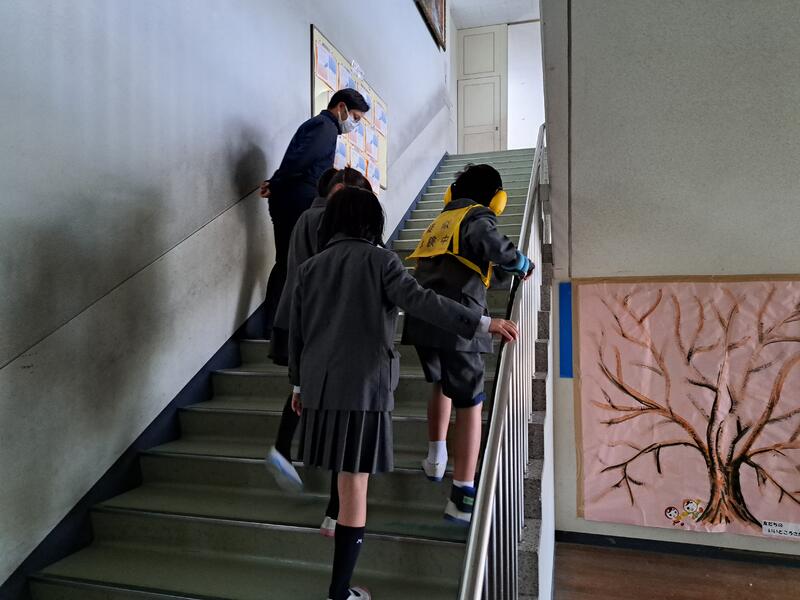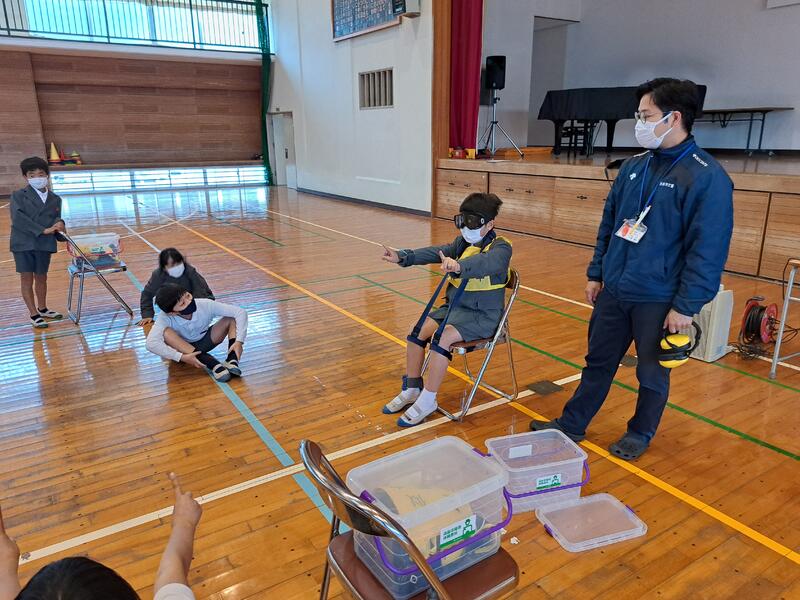 総合的な学習の時間の授業では、これまで身の周りの福祉について調べ、バリアフリーやユニバーサルデザインについて学習してきました。11月14日(金)は、玉名市社会福祉協議会の方を招き、福祉について講話をしていただいたり、学校内でアイマスク体験をさせていただいたりしました。子どもたちは、アイマスク体験を通して、目に障がいがある人の立場になって考え、友達と協力して活動に取り組むことができました。