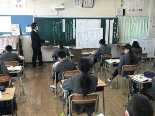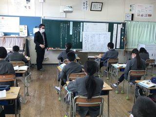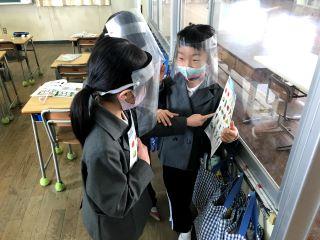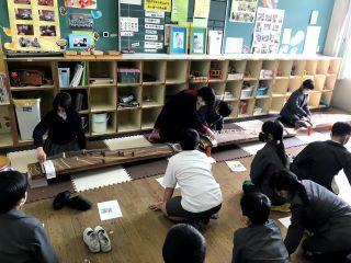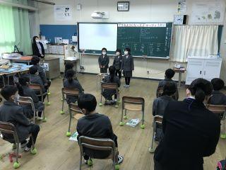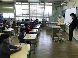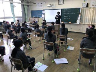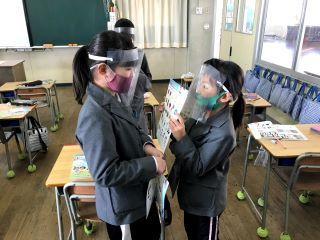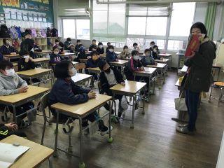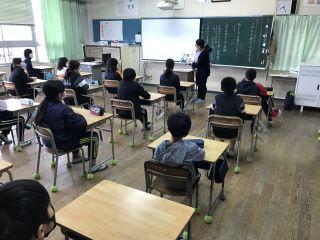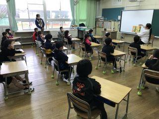 2月9日(火)4校時授業を2つ紹介します。まず、3年2組の外国語活動「What.this?これなあに?」です。丁度、フェイスシールドをつけて交流をしているところでした。2つ目は、4年生音楽「日本の音楽に親しもうです」雰囲気を出すために和服を着て指導されていました。