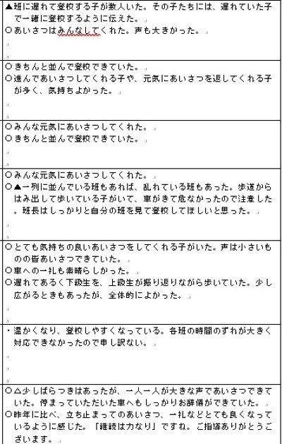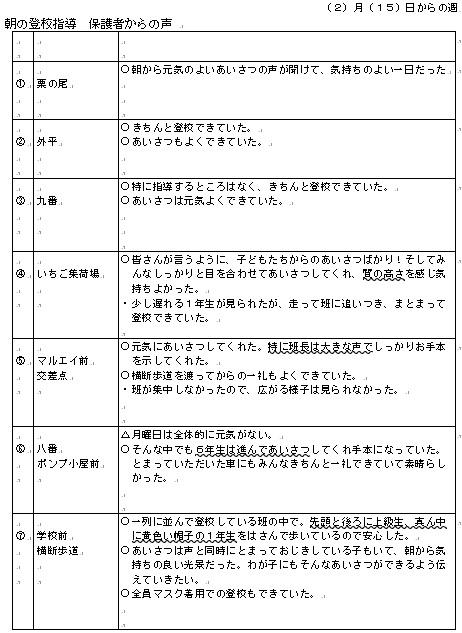 3月12日(金)子供達の登校時のあいさつや礼が良くなっているとお伝えしていましたが、3月第2週から登校班の乱れが出てきています。あいさつや礼ではなく、登校班がバラバラになったり少数で登校したりしている班があります。原因は、朝、時間に起きることが出来ていないのではないかと思います。学校でも指導をしますが、各家庭でも早めに起床させたり集合時刻を確認したり等、子供達への声かけをお願いします。下の保護者の声は、左が3月1日(月)で、右が、3月8日(月)の分です。