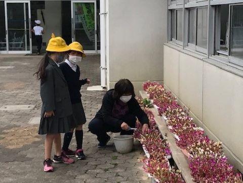 3月2日(火)3月1日よりスクールサポートスタッフとして、横島町で民生委員・児童委員をしていただいている吉村様に協力していただくことになりました。新型コロナウィルス感染症により学校の業務が増えるので、負担軽減につながるようにと配置して頂きました。大変ありがとうございました。写真は、花の手入れをしていただいている場面です。1年生の子供達が、そばに行ってお話をしていました。