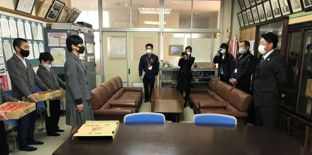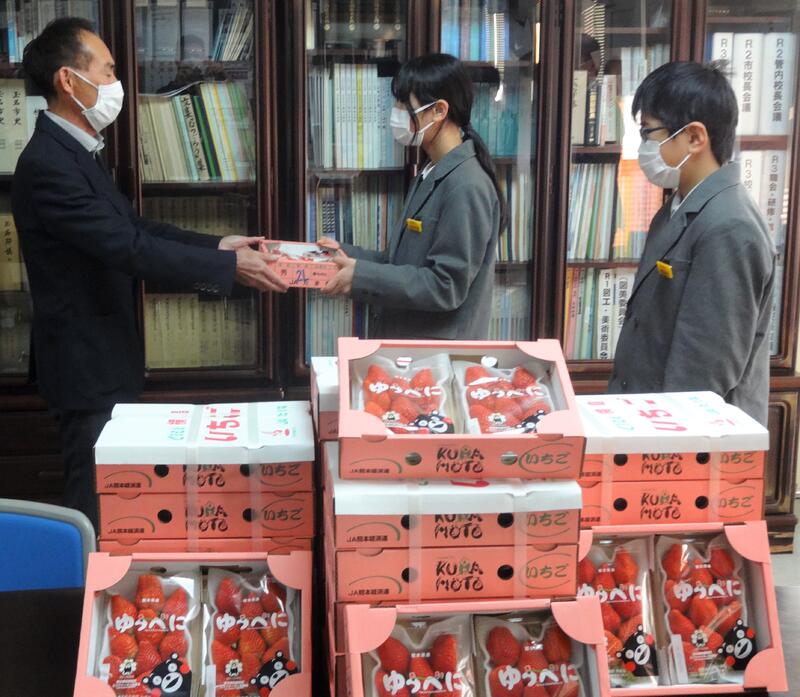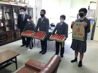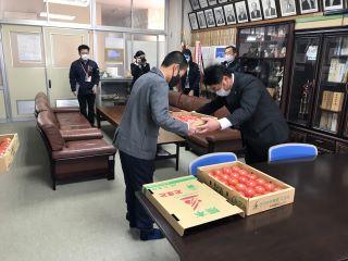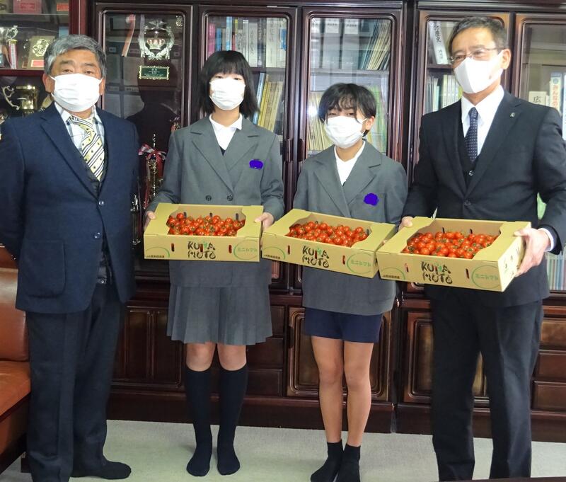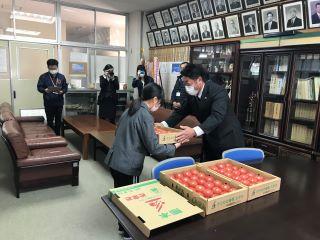 3月3日(水)始業前、トマト贈呈式を行いました。例年のことですが、以前お伝えしたイチゴ等に加え、玉名市野菜振興協議会よりトマトをいただきました。運営委員会の子供達が、受け取りお礼を述べました。