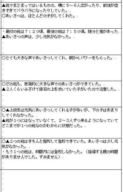 また、明日からの金曜までは、5年生以下の登校班登校になります。5年生以下のリーダーのみなさんどうぞよろしくお願いします。保護者の皆様には、重ねてご心配をおかけしますが、どうかご理解とご協力をお願いいたします。