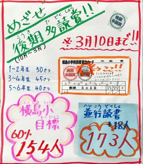 3月15日(月)以前お伝えしたように図書委員会では、みんなに本をたくさん読んでもらうために多読賞を設けて表彰する取組を行っています。昨年度の達成者は、約3割でした。今年度は、前期目標を4割に設定して、いろいろな取組をした結果、以前お伝えしたように見事達成できました。後期は、目標を6割に高めて取り組み、大きく上回る68%を3月10日に達成したそうです。図書委員の皆さん取組ありがとうございました。