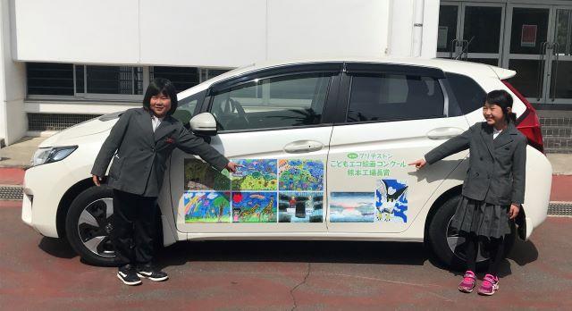16日(水)、ブリヂストン熊本工場長様をお迎えして、校長室で「ブリヂストンこどもエコ絵画コンクール」の表彰式を行いました。今年度は、「熊本工場長賞」に2人の児童が、「熊本工場賞」に1人の児童が選ばれました。「熊本工場長賞」の2つの作品は、社有者にラッピングされていました。