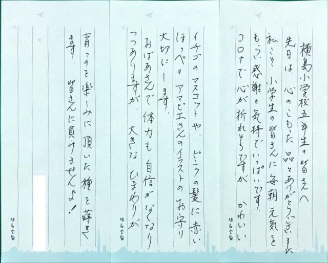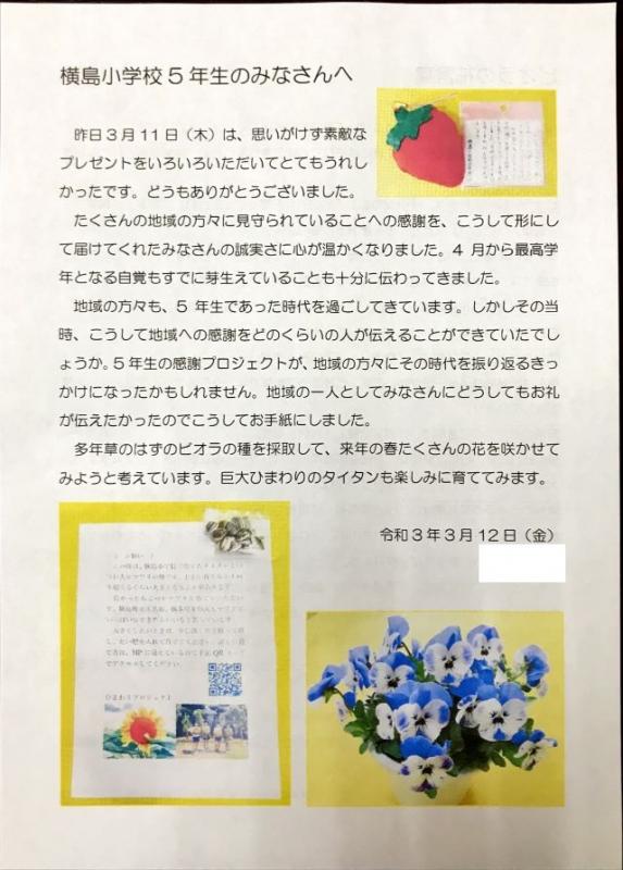 3月16日(火)5年生が行っている感謝プロジェクトにお礼の手紙をいただきました。こちらがお礼を伝えているのに反していただきありがとうございます。子供達がとても喜んでいます。