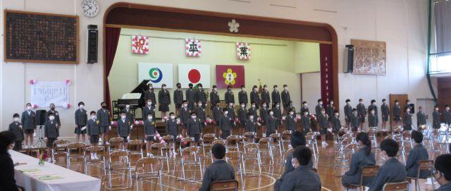 3月24日(水)卒業式でした。新型コロナ感染症対策で、マスク着用、換気実施、距離を取る、消毒実施等の対策をして行いました。参加者は、卒業生、保護者、5年生、職員でした。制限のある中、子供達は、素晴らしい態度で呼びかけや歌唱ができました。
