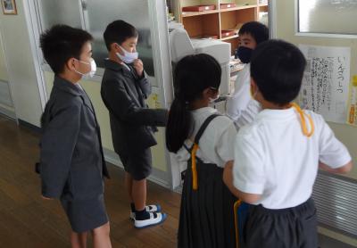 4月30日(金)1・2年生が学校探検を行いました。案内役は2年生です。各班のリーダーとして1年生を誘導し、各教室で、ポイントを押さえて、丁寧に説明をしていました。「すごいなあ。」と思いました。1年生も、静かに見学することができていました。