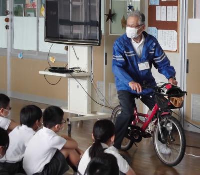 前日は天気予報を見ながら、どうにか交通教室が屋外でできそうだと期待していましたが、19日(水)の登校時間は、雨。結局、自転車を押しての登校ができなかったので、急遽、屋内で実施することにしました。6つの学年を2時間に分け、さらに場所も2か所に分けて実施しました。子供たちは、しっかり話を聞くことができていました。