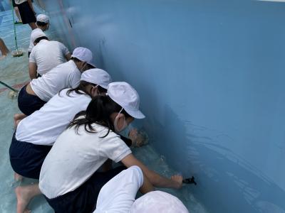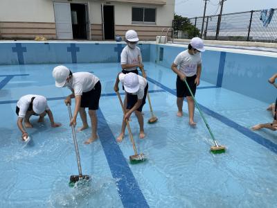 6月7日(月)にプールそうじを行いました。高学年の子どもたちは、大プールや更衣室の掃除を、中学年の子どもたちは小プールや、プールの溝の掃除を頑張りました。掃除が終わったプールはピカピカで、気持ちよく水泳の学習が始められそうです。