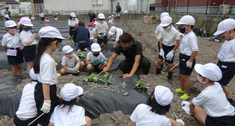 4Hクラブ(農業青年クラブ)の方々にお世話になり、1~3年生児童がいも植を行いました。今年は、畑も学校の目の前で、いろいろな種類のいもを植えました。どんないもができるのか楽しみです。