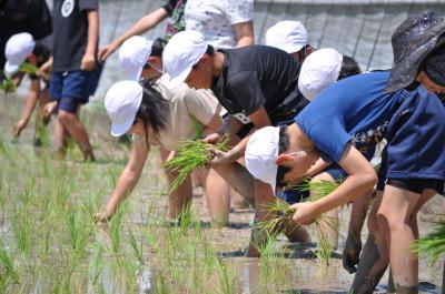 5年生の子どもたちは29日(火)の5・6時間目に、4Hクラブ(農業青年クラブ)の方々のご協力のもと、田植えを行いました。初めて手植えを経験した子も多く、貴重な体験となりました。