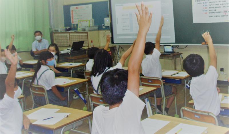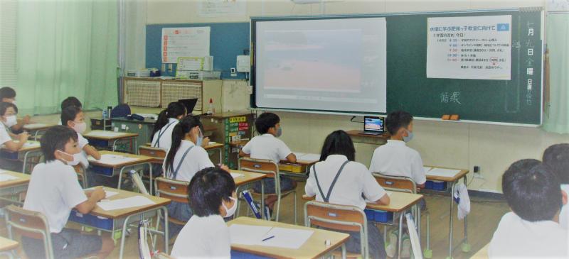 今年の「水俣に学ぶ肥後っ子教室」はオンラインで行われ、9日(金)に有明中校区3小学校の5年生がそれぞれの教室から参加しました。スクリーンに映る先生の問いかけにしっかり反応し、メモを取りながら環境学習を受講したり、水俣病に関する語り部さんの講話を聞き、質問したりとがんばっていました。約3時間の研修でしたが、みんな、とても集中できていました。