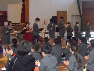 11月17日(水)樂奏団「ゆめのねいろ」の皆さんをお招きして、音楽鑑賞会を行いました。ピアノやフルートなどのきれいな演奏を聴き、心安らぐ充実した時間となりました。演奏の合間には、代表の児童が打楽器を担当して一緒に演奏する場面もありました。子どもたちにとって、本物に触れる貴重な時間となりました。