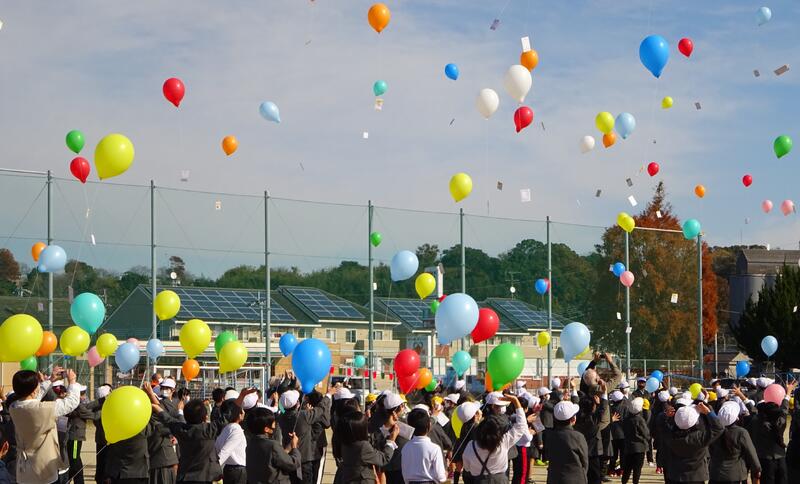 12月6日(月)、「人権の花」運動で育てた花から取れた種を風船に付けて飛ばしました。