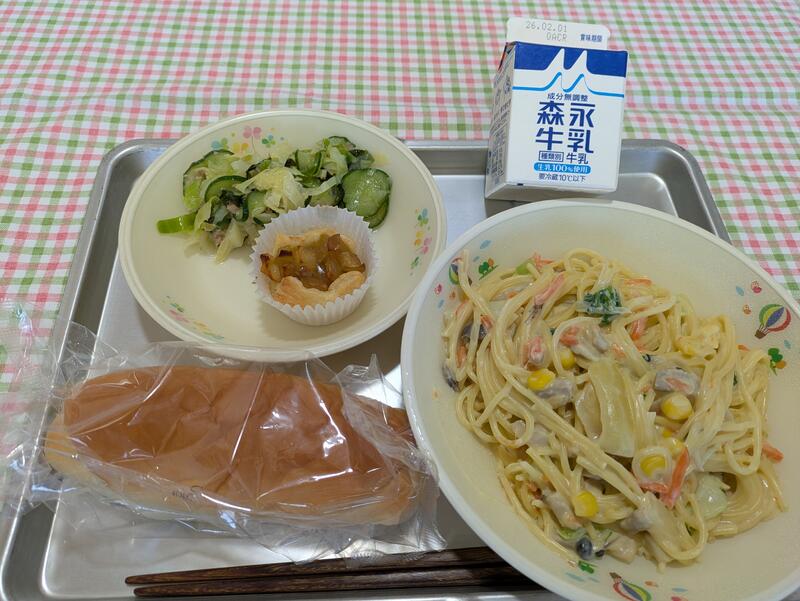 今日のメニューは、ミルクパン、豆乳クリームスパゲティ、ツナサラダ、アップルパイ、牛乳でした。今日は、水曜日で主食がパンの日でした。