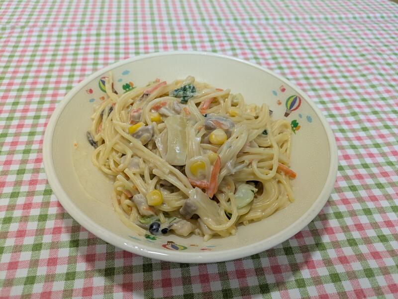 豆乳クリームスパゲッティは、茹で上がったパスタ麺をベーコンと人参、玉ねぎ、チンゲン菜、コーンと一緒にバターで炒めて、豆乳クリームで煮てありました。麺の茹で具合や具材と豆乳クリームの旨味がとてもよくて、超逸品のおいしさでした。