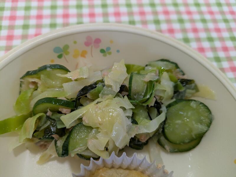 蓮根梅マヨサラダは、シャキシャキした食感の蓮根に、人参と胡瓜、しめじ、それにツナを入れて、梅マヨドレッシングでからめてありました。野菜の食感と、ツナと梅マヨドレッシングが、とてもよくて、子どもたちもおいしく食べていました。