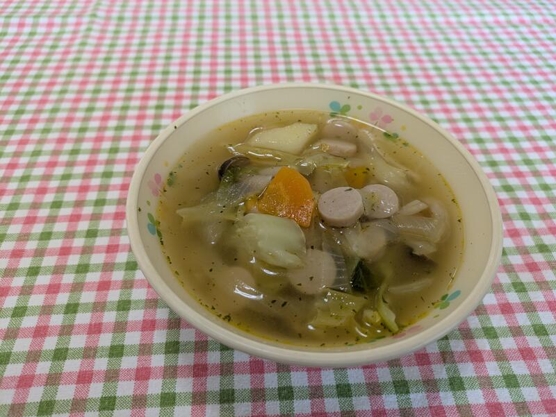 野菜スープは、チキンブイヨンにほどよく塩が効いていて、具材の旨味と混ざり合って、これまたおいしかったです。温かくて、ウインナーも入っていて、子どもたちも喜んで食べていました。