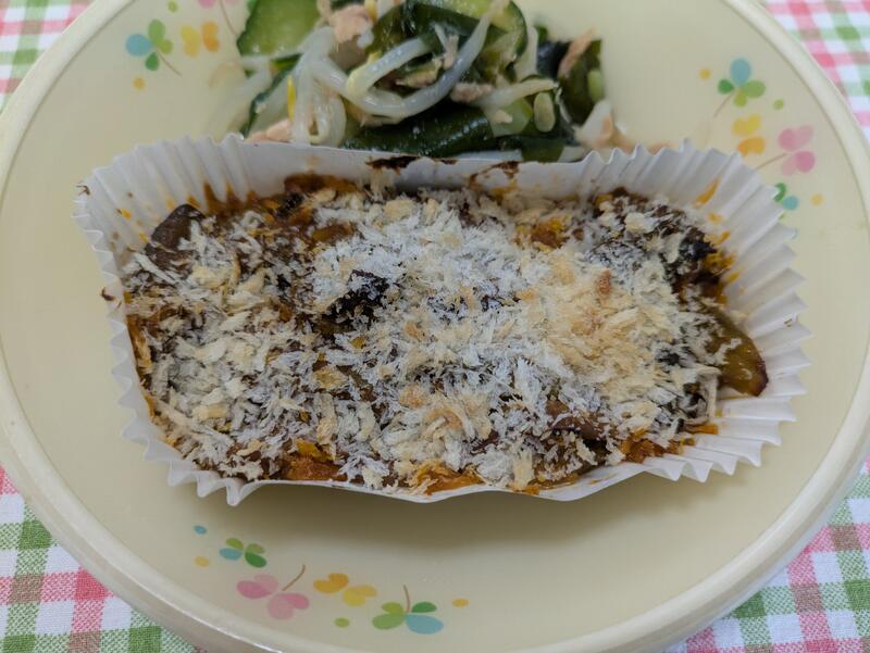 卵アレルギー対応は、ハンバーグにチーズをのせてスチームコンベクションで焼き上げてありました。卵アレルギーの子どもも喜んで食べていました。給食の先生方に心から感謝します。さすが横島小学校です。