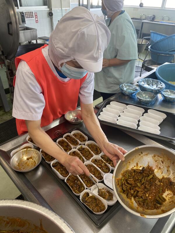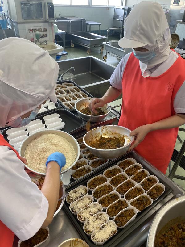 スパニッシュオムレツは、スペインの伝統的な卵料理のことで、横島小のスパニッシュオムレツは、一つ一つ手作りで、じゃがいもとたまねぎを、チーズを混ぜた卵に入れてスチームコンベクションで焼き上げてありました。チーズと塩加減がとても合っていて子どもたちも喜んで食べていました。