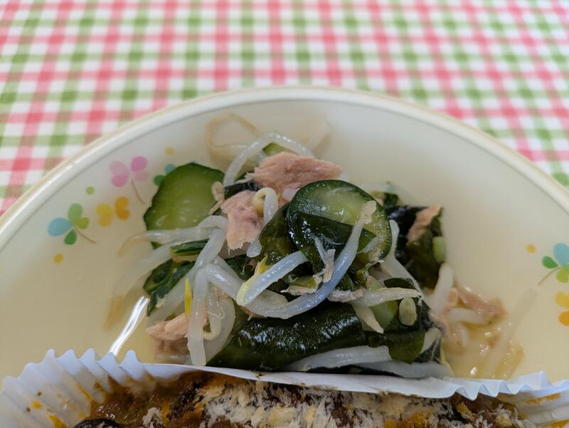 もやしの中華和えは、メインのもやしがたっぷりと入っていて、人参や胡瓜、きくらげもたくさん入れてありました。味付けは、甘酢がほどよく効いていて、胡麻油の香りもよくて、とてもおいしかったです。横島小の和え物やサラダは、身体の調子を整える野菜が、種類も量もたくさん入っていて、その上においしい味付けです。心から感謝します。
