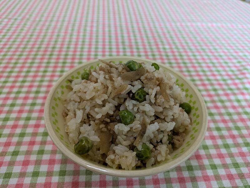 その上に、いつもおいしい麦ご飯をわかめご飯してありました。わかめご飯の単品だけでもおいしかったのに、今日もおいしいおかずで、“あっ”というまに大盛のわかめご飯がなくなりました。
