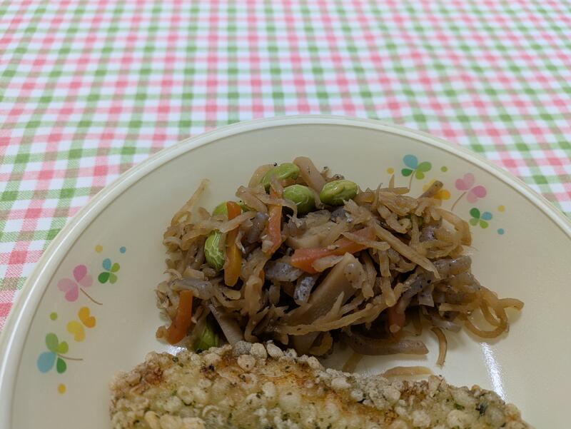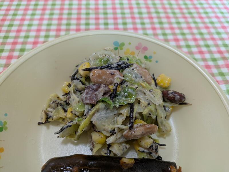 胡豆昆サラダは、すり胡麻とミックスビーンズ、ひじきをキャベツとノンエッグマヨネーズで絡めてあり、子どもたちが喜ぶコーンも入れてありました。私も子どもたちもバランスの取れた栄養たっぷりのサラダをおいしく、たくさん食べることができました。