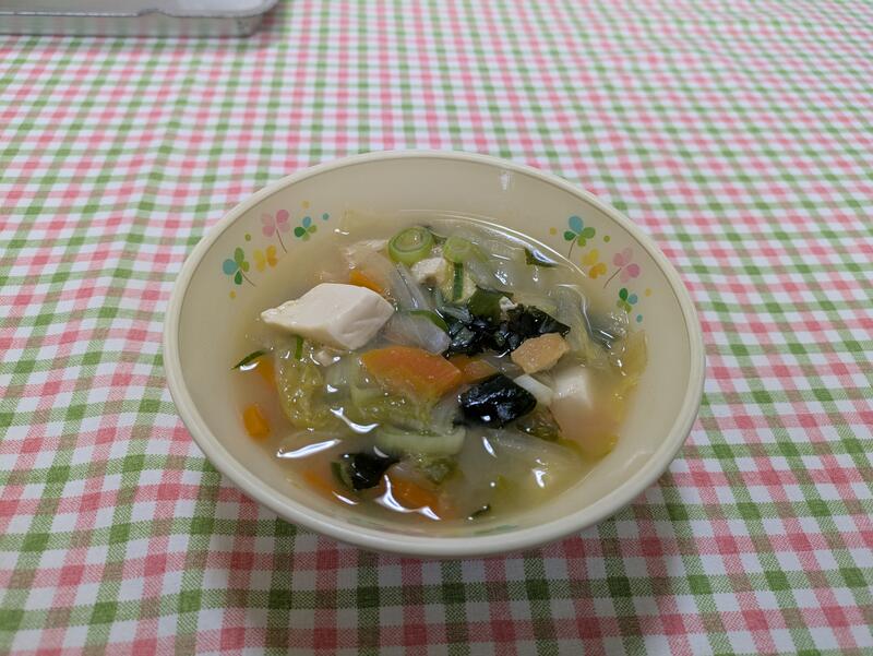 寒くなってくると白菜がおいしくなってきます。今日は、その白菜をたっぷりと使って、いりこの出汁が効いたおいしい味噌汁でした。人参や玉ねぎ、ねぎ、わかめの具材の旨味が、地元山本豆腐店の油揚げや豆腐にしみ込んで、甘味のあるとてもおいしい味噌汁でした。