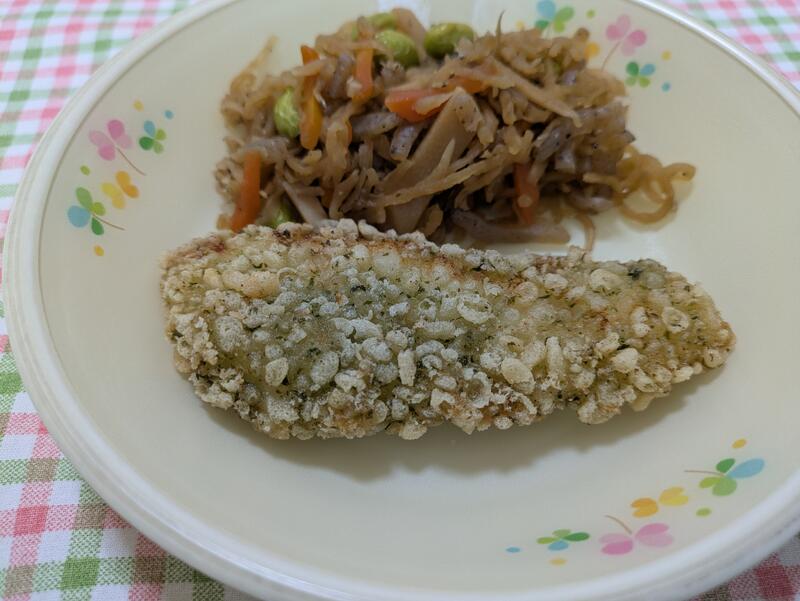 さつまいもサラダは、たくさんのキャベツと胡瓜に鶏ハムと素揚げにしたサツマイモをまぜて、子どもたちが好きなノンエッグマヨネーズで味付けしてありました。マヨネーズがからんだ具材に、素揚げされたサツマイモの食感がとてもよくて、逸品のおいしさでした。