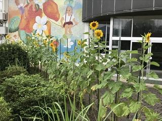 7月26日(日) 一番高くなっていたひまわりが咲きました。最高到達点は、3m33cmでした。残年ながら4mには届きませんでしたが、大きくてきれいな花を咲かせてくれました。早く咲いた花は、花が大きくなりすぎて頭をたれています。3年生がお世話をしているひまわりも8割方咲きました。白い棒の長さが3mです。