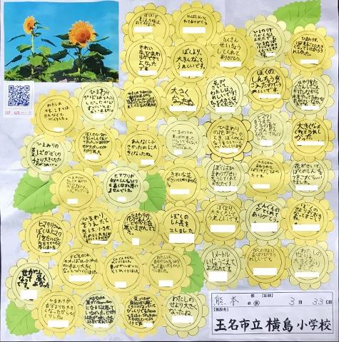 9月2日(水) 3年生が寄せ書きを作成してくれました。これをひまわりのせいくらべに応募します。目標4mには届きませんでしたが、今年度は、大きさも揃って同じ時期に花が咲いたのでとてもきれいでした。お世話をしてくれた3年生大変ありがとうございました。