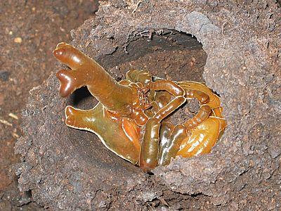 この写真の答えをお伝えします。答えは、セミの若齢幼虫です。何のセミかは不明です。セミは、7、8月頃、樹皮(じゅひ)に卵(たまご)をうみます。1年後の梅雨(つゆ)の時期に水分に反応して孵化(ふか)します。そして、土の中に入り種類(しゅるい)によって数年(3年~17年)すごします。その後、地上にあらわれ羽化(うか)し、成虫(せいちゅう)として1ヶ月ほど生活して死んでいきます。このめずらしい若齢幼虫は、20数年前、2年生の男の子が、木の幹を地面に向かって降りているところを捕まえてきたものです。よく木を観察(かんさつ)していると、見つけることができるかもしれませんね。