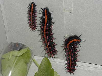 昨日の答えは、ツマグロヒョウモンの幼虫でした。大人は気味悪がる人もいますが、子供達には結構人気です。両手に一杯はわせている子もいるほどです。食草は、パンジー等のスミレ類です。下にさなぎと成虫の写真を載せておきます。