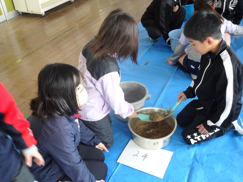 「1kgチャレンジ」 目測で砂を1kgずつ各学年1つのバケツに入れて、6つのバケツの重さが6kgとの誤差を点数にするゲームです。