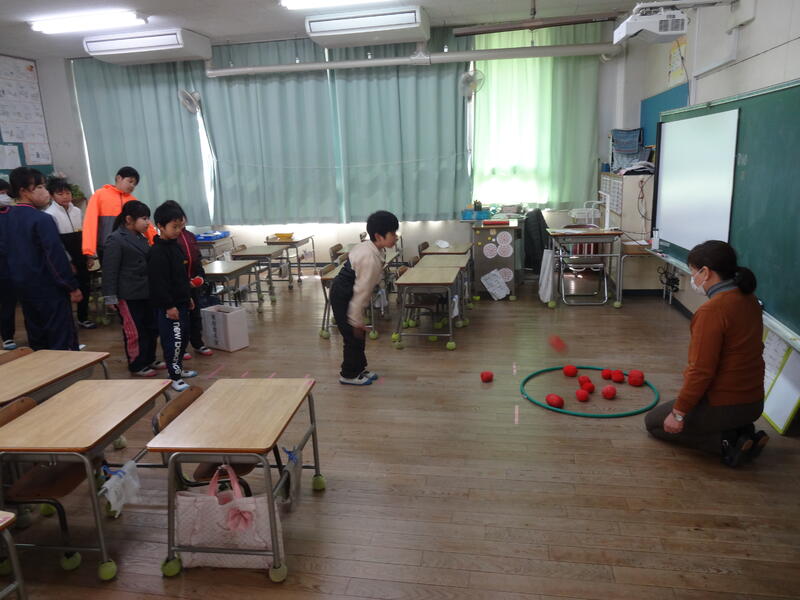 「お手玉チャレンジ」 班の全員が1回ずつお手玉を投げて、輪の中に入った数で点数を決めるゲームです。