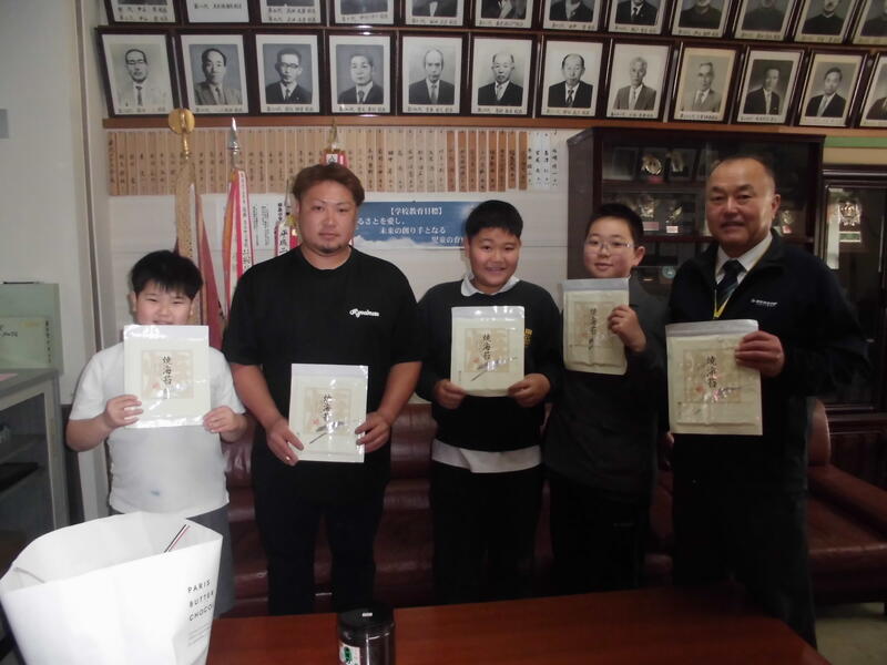 地域で海苔の生産に取り組んでおられる中尾様から海苔を寄贈していただきました。突然のことでしたが、そこに居合わせた児童がお礼の言葉を伝えました。