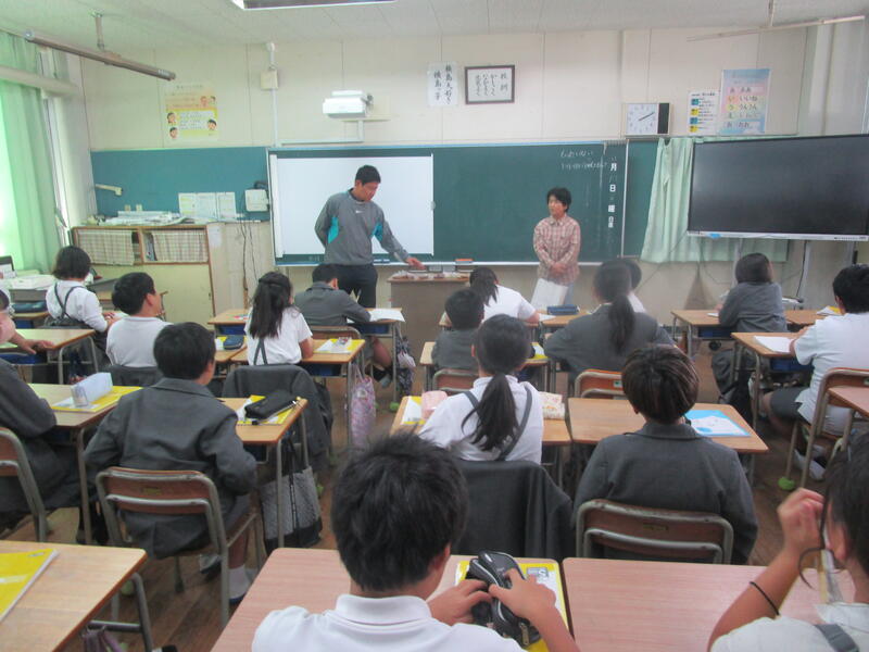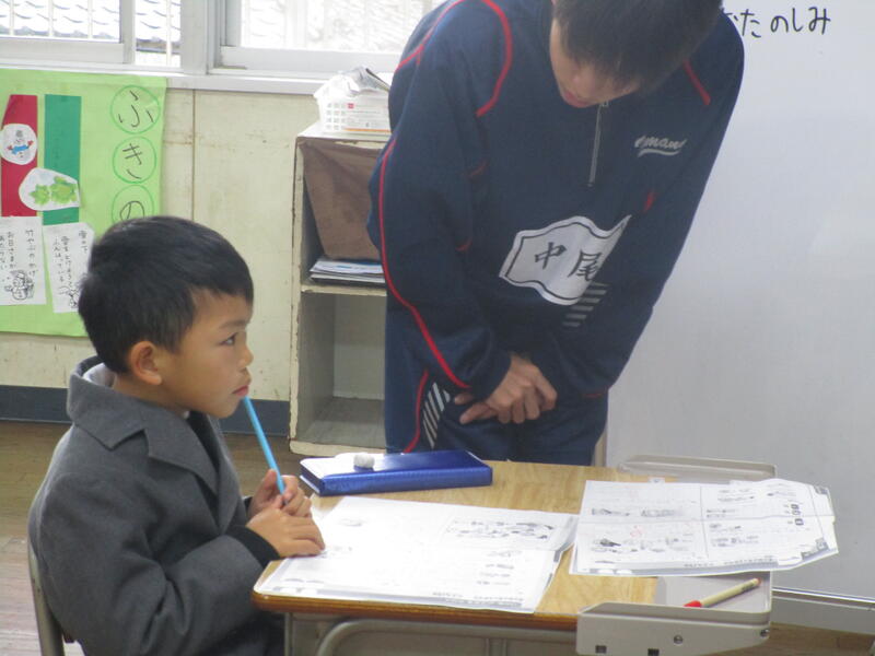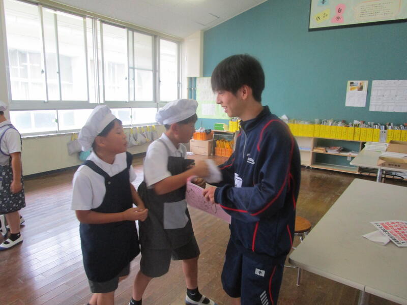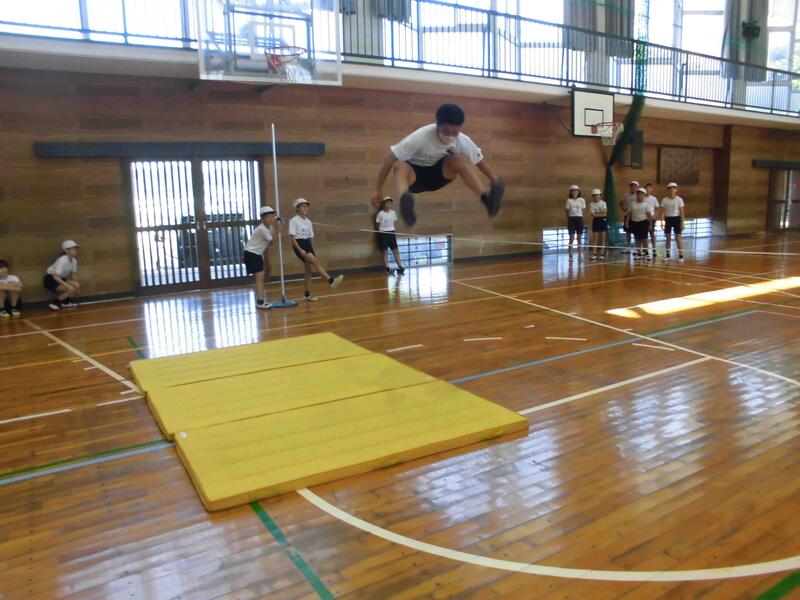 中学生がそれぞれの教室で、プリントの丸付けをしたり、じゃんけん列車をしたり、子ども達の発表にアドバイスをしたりしてくれるので、子ども達もうれしそうでした。4年生の体育「走り高跳び」に参加した中学生は、デモンストレーションで走り高跳びを披露してくれました。130cmを軽々と飛び越える姿に歓声が上がり、憧れのまなざしを向けていました。また、午後からは、校内の掃除や除草シート張りの手伝いをしてくれました。