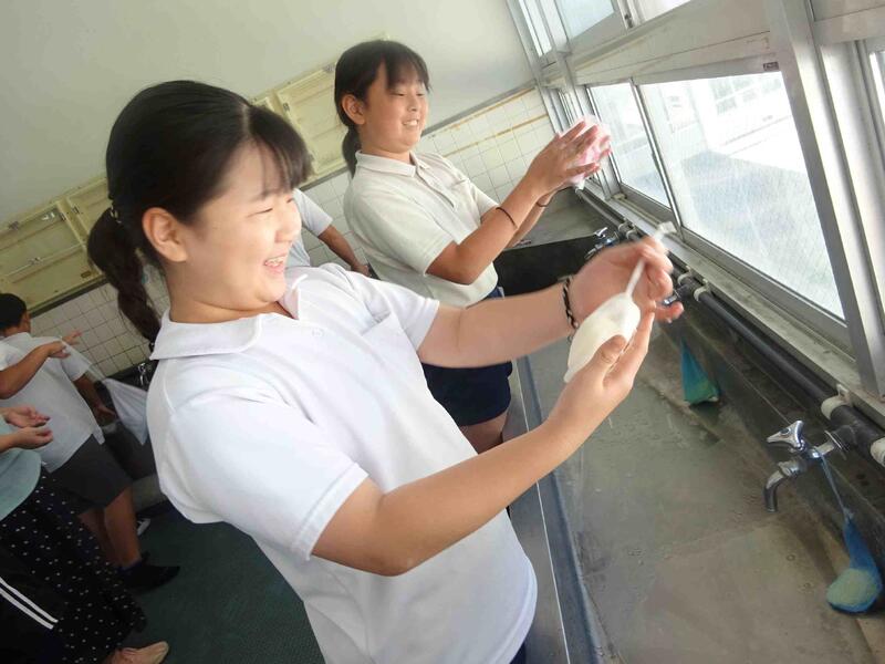 下の写真はいただいた「玉潤」で手を洗っているところです。泡立ちがよく、すべすべになったと好評でした。