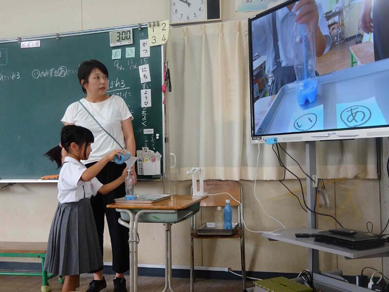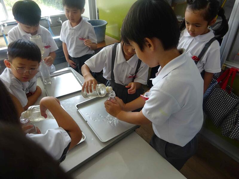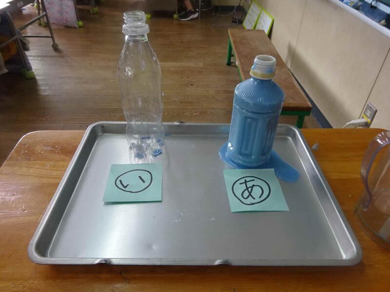 「形の違うペットボトルのどちらに多く水が入るか」知りたいというテーマのもと、「どちらか多いか、比べ方を考えよう」というめあてを立てて、課題の解決に取り組みました。子ども達からは比べる方法として、「別のコップに移し替える。」「小さいコップ(何個分か)で比べる」「どっちかのペットボトルに入れてみる」が出てきました。そして、どちらかのペットボトルに入れるという方法で比べてみました。