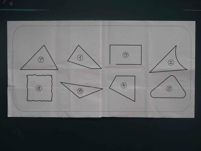 校長先生から2年生に、「2年生のみなさんは、三角形や四角形のべんきょうをしていると聞きました。この8枚の図形は、三角形かな。四角形かな。そのわけも教えてください。」という手紙と下の写真が届きました。