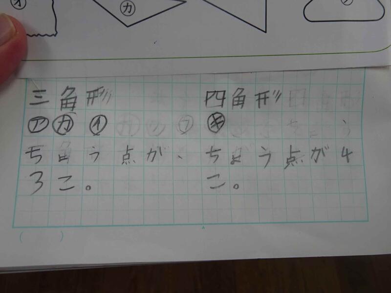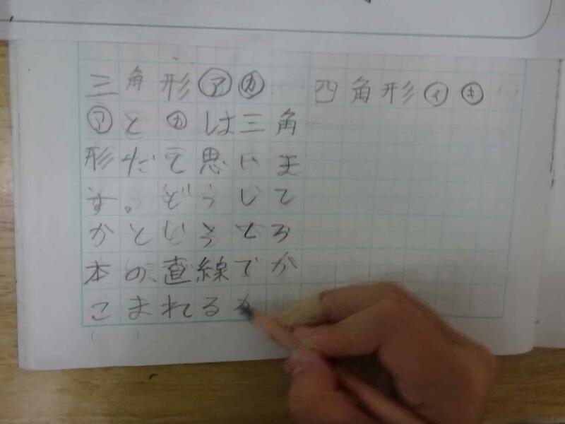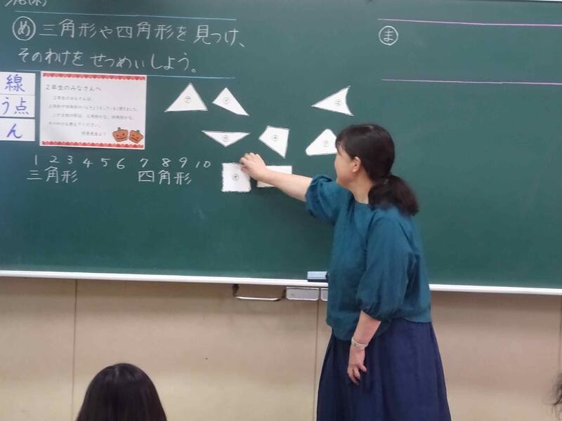 子ども達は、校長先生に教えてあげようと一生懸命に課題に取り組んでいました。まずは、三角形と四角形の定義についての復習でした。定義に照らして分類する活動は、これからの算数科の学習でも使えるし、日常生活でも使える考え方です。次に、仲間分けの活動をしました。1人学び、ペアトークをしながら、自分の考えを整理していました。最後に、全員で仲間分けをしました。「校長先生に理由も教えてあげなくちゃ」と張り切っている姿がありました。子ども達が出した結論は写真をご覧ください。