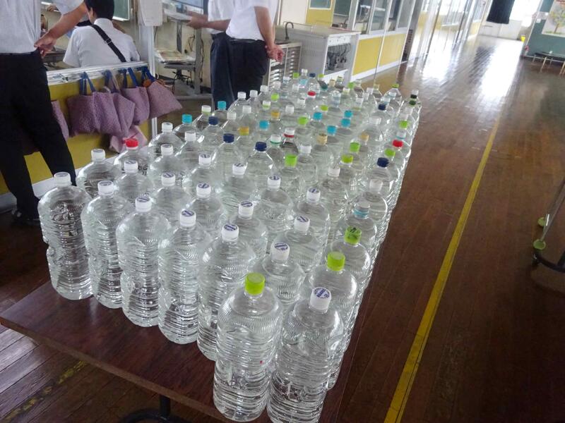 まず最初に、どんなことに水を使っているのかを出し合いました。お風呂、トイレ、洗濯などなど、たくさんのことに水を使っていることを確認しました。そのあと、水の入ったペットボトルを200本見ました(下の写真)。1日に使う量を目で見ることで「こんなに使っているんだ。」と実感できたようです。ペットボトルの収集にご協力いただいた皆様に感謝します。