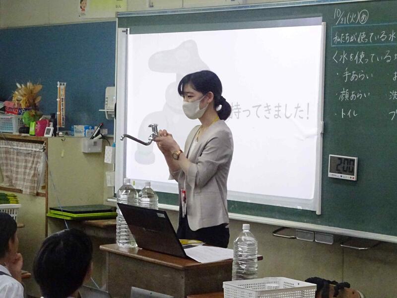 次に、蛇口の実物を見せました。水道管につながっていないので、蛇口をひねっても、もちろん水は出ません。でも家や学校の蛇口をひねると水は出ます。「その水はどこから来るのか」ということをみんなで考えました。