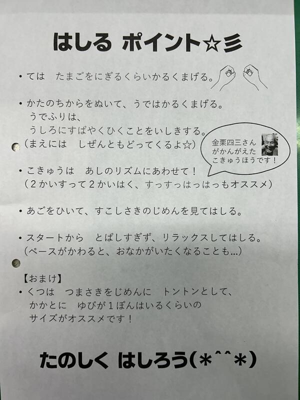 今日の3時間目に、学習支援ボランティアの保護者の方から走り方を教えていただきました。ポイントはこれ↓