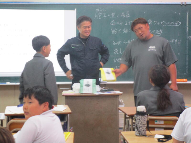 また、中尾さんは海苔の育て方や収穫方法を工夫することで、海苔の生産量や品質を落とさないようにされているということでした。お二人からはそれぞれ、トマトケチャップや海苔を試食させていただきました。工夫や思いが詰まった味に5年生の子ども達も大変喜んでいました。