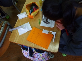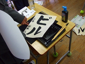 | 3年生は1組も2組も書写の時間でした。 毛筆で「ビル」を清書していましたよ。 | 4年1組は、二分の一成人式の「招待状」を作成中!! |
